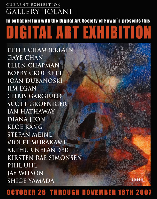 Gallery `Iolani A Digital Fine Art Exhibition October 26 - November 16, 2007 The Digital Art Society of Hawaii (DASH) opens it's second major exhibition of Digital Fine Art. Works chosen for the exhibition include "Invisitor", "Mongkok" "S.Boats", "Sons of Hawaii" and "Incoming", Honolulu Advertiser Review by David Goldberg . TRANSPAC 2007 Awards Banquet DVD........ The 2007 TRANSPAC Awards Banquet DVD is now available. Produced by Leslie DeMeuse and Roy Disney, and directed by Phil Uhl. The video is available in Hawaii at the Hawaii Yacht Club and Waikiki Yacht Club gift shops, as well as from Gaylord Sportsware on the mainland. . Cambridge........