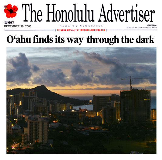 Island of Oahu complete power black out. Full story:..Honolulu Advertiser December 28th. 2008